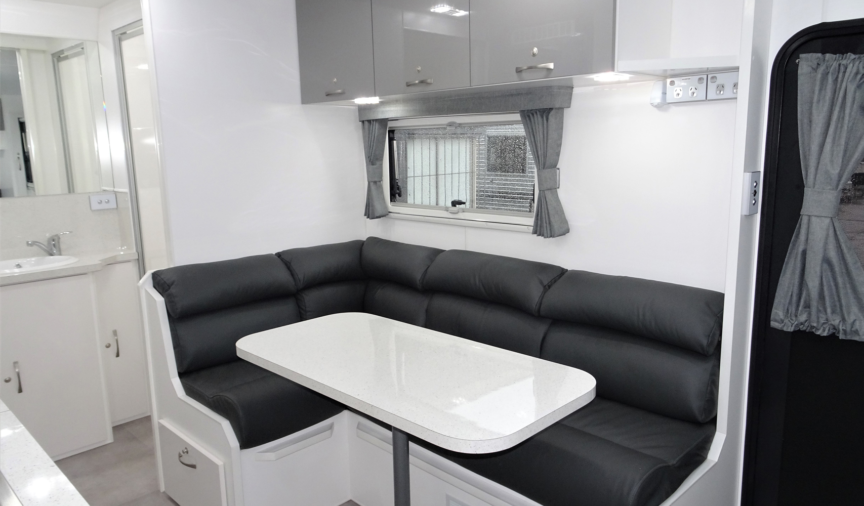L-Shaped dinette converts to extra bed or Bifold table at café seating